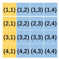 样例解释 图中标注为黄色的四个格子是黄金格,坐标分别为 (1,1),(2,1) ,(3,1) ,(4,1) 。