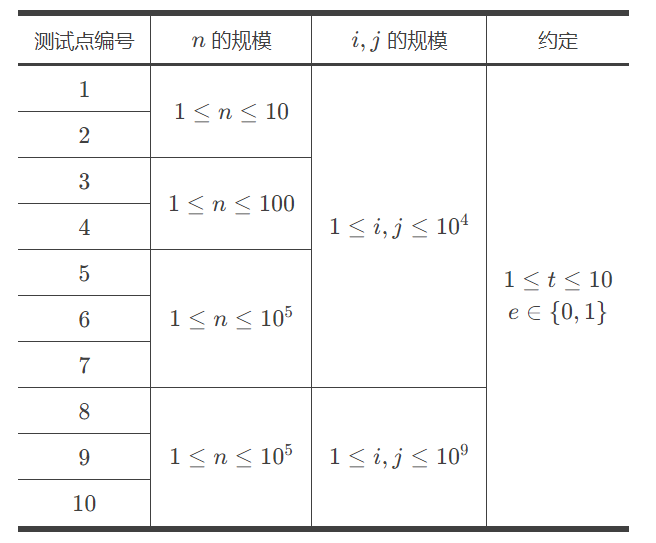 第一行包含一个正整数 n,表示该问题中需要被满足的约束条件个数。接下来 n 行,每行包括三个整数 i,j,e,描述一个相等/不等的约束条件,相邻整数之间用单个空格隔开。若 e=1,则该约束条件为 x_i=x_j。若 e=0,则该约束条件为 x_i\neq x_j。